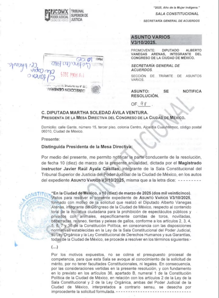 A 11 de marzo del 2025.- El Poder Judicial de la Ciudad de México desechó el freno a la iniciativa que busca la prohibición de las corridas de toros, luego de que el magistrado Javier Raúl Ayala aseguró que la Sala Constitucional no tiene facultades constitucionales, ni legales para seguir con el recurso interpuesto por el morenista Alberto Vanegas, quien buscaba analizar si la eliminación del ‘acto de tortura’ daña los derechos humanos de los trabajadores de la tauromaquia.