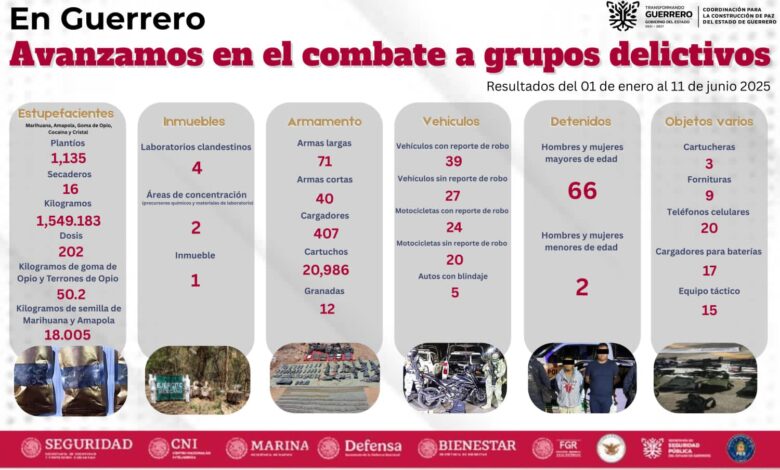 Chilpancingo, Gro., 13 de junio de 2025.- Como resultado de las acciones coordinadas entre el Gobierno del Estado de Guerrero y la Secretaría de la Defensa Nacional, se han logrado avances contundentes en el combate a grupos delictivos en la entidad, informó la Mesa de Coordinación para la Construcción de Paz en Guerrero, al presentar el informe correspondiente al 1 de enero al 11 de junio del presente año.