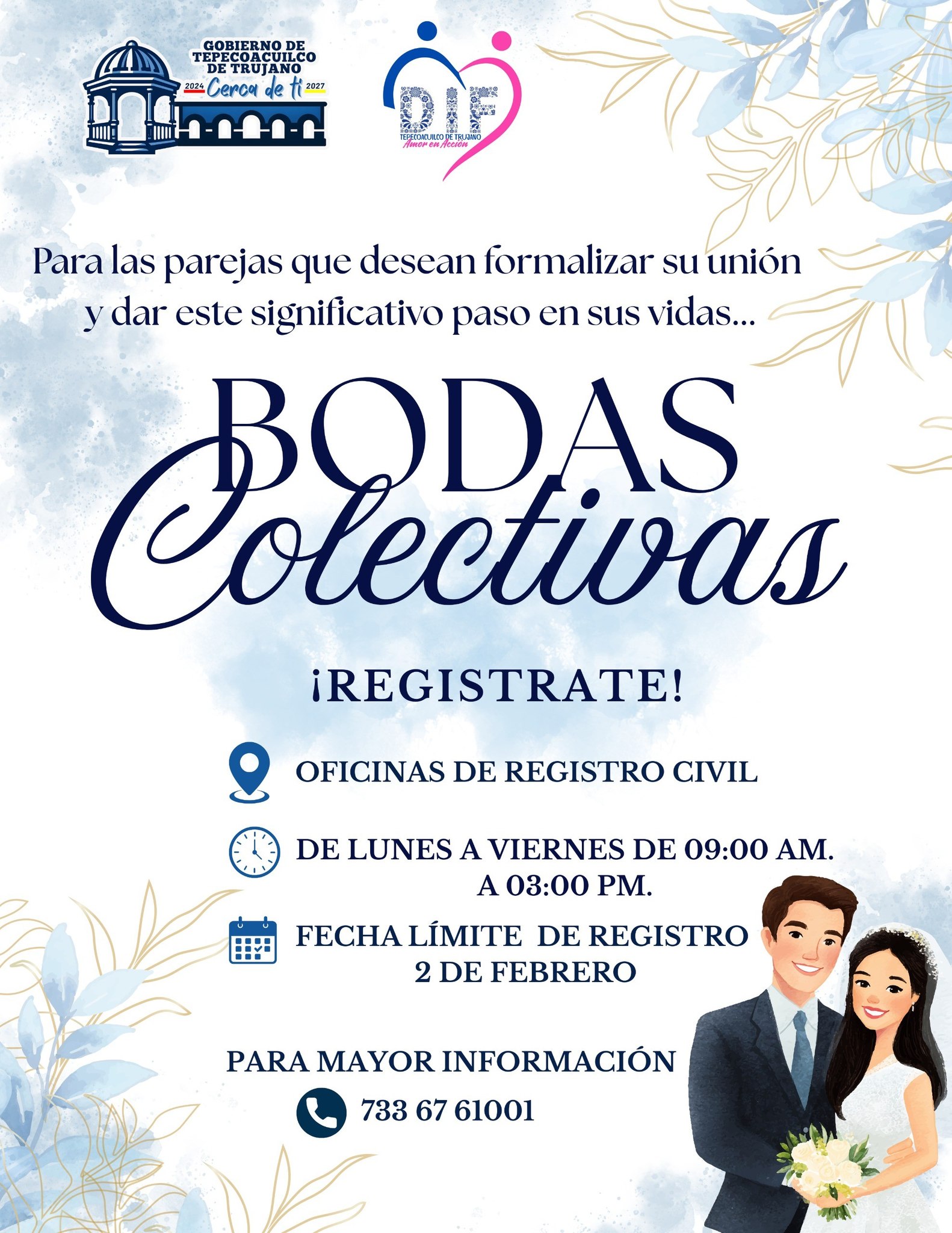 Tepecoacuilco, Gro., a 23 de enero del 2026.- El H. Ayuntamiento Municipal de Tepecoacuilco, a través de la Oficialía 01 de Registro Civil, invita a todas las parejas interesadas en formalizar su unión a participar en las Bodas Colectivas, las cuales se llevarán a cabo el próximo 13 de febrero en la ciudad de Chilpancingo.