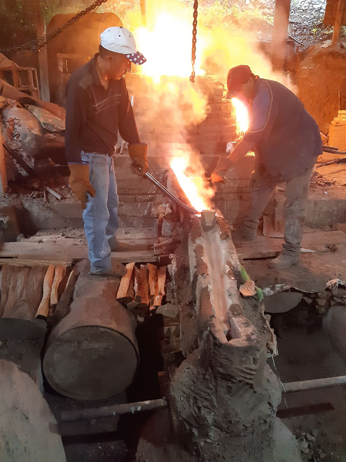 El proceso es completamente artesanal: primero se crea un molde de barro y cera, luego se mezcla el metal —generalmente una aleación de bronce y estaño—, y finalmente se vierte el material fundido para dar forma al cuerpo de la campana.