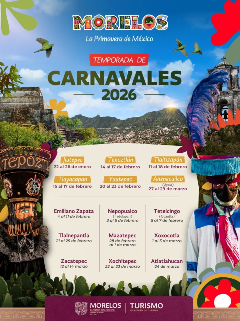 La Secretaría de Turismo de Morelos, en días recientes, ha anunciado el calendario de los carnavales del estado en el 2026. Está compuesta por 15 destinos de la entidad, sitios en donde se realizará esta celebración en el presente año. Como es bien conocido, el carnaval morelense tiene como emblema el “Brinco del Chinelo”. Esta danza es característica de varios lugares del estado, entre ellos Jiutepec, Tepoztlán y Tlayacapan.