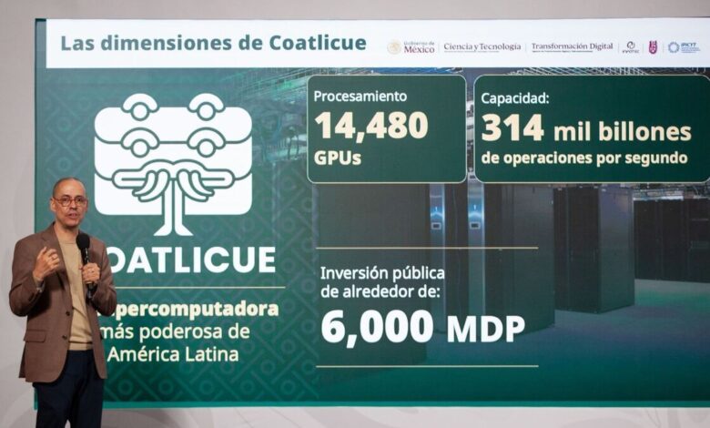 A 27 de noviembre del 2025.- El Gobierno de México presentó este miércoles a Coatlicue, la primera supercomputadora mexicana que será “la más poderosa de Latinoamérica” gracias a sus 14 mil 480 unidades de procesamiento gráfico (GPUs) y una capacidad de 314 mil billones de operaciones por segundo, según José Merino, titular de la Agencia de Transformación Digital y Telecomunicaciones.
