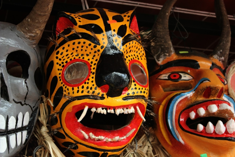 En la cara llevan máscaras talladas en madera o elaboradas de cuero, pintadas con expresiones dramáticas o burlonas. Estas máscaras no solo ocultan la identidad del portador, sino que también dan vida a personajes específicos: campesinos, animales y figuras cómicas o sobrenaturales.