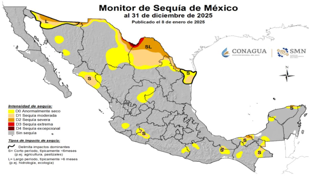 A 14 de enero del 2026.- El 2025 cerró con una disminución de sequía en México, en comparación con diciembre del 2024. 13 estados no registraron ninguna afectación por escasez de agua.