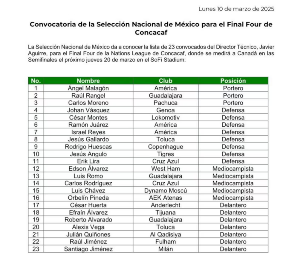 A 11 de marzo del 2025.- La Selección nacional de futbol dio a conocer las lista de 23 convocados por el entrenador Javier Aguirre para disputar los compromisos del Final Four de la Liga de Naciones de la Concacaf, donde se buscará conquistar por primera ocasión este campeonato.