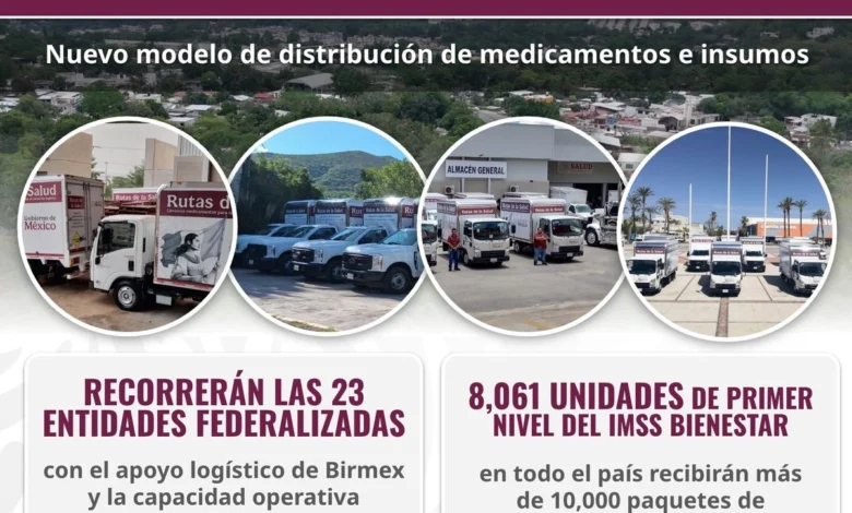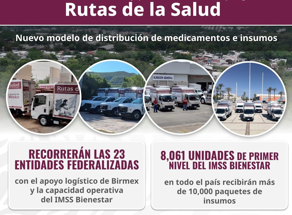 Rutas de la Salud es un nuevo mecanismo de distribución –con vehículos vía terrestre– que en su primera semana entregará 15 millones de piezas de 147 tipos de fármacos e insumos médicos de primer nivel a 8 mil 61 unidades del IMSS-Bienestar en los 23 estados en los que opera.