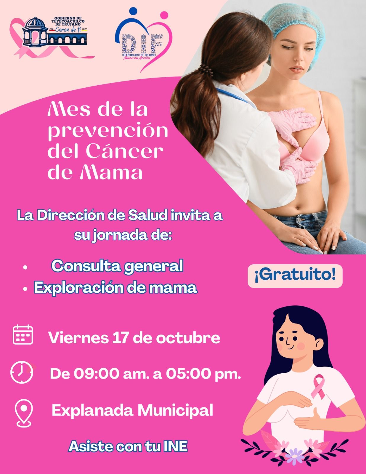 Tepecoacuilco, Gro., a 16 de octubre del 2025.- En el marco del Día Internacional de la Lucha contra el Cáncer de Mama, el H. Ayuntamiento de Tepecoacuilco, a través de la Dirección de Salud, invita a toda la ciudadanía a participar en una jornada especial dedicada a la prevención y detección temprana de esta enfermedad.