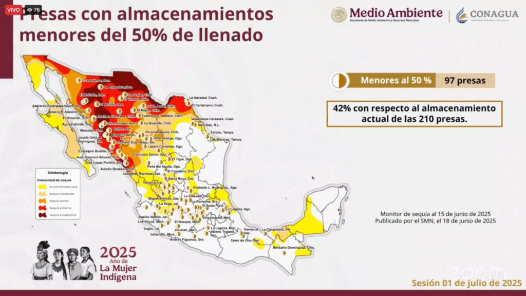 Respecto a las 210 presas principales del país, 97 tienen niveles de llenado menores al 50%, lo que representa el 42% del almacenamiento total nacional, según Daniel Arriaga Fuentes, subgerente de Hidrología Operativa de la Comisión Nacional del Agua (Conagua).
