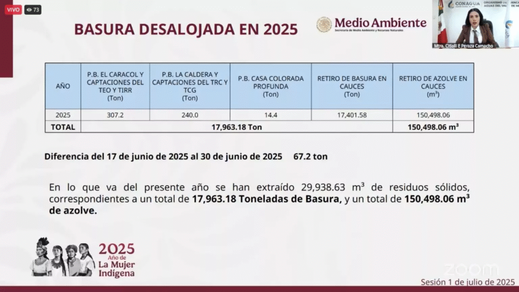 En paralelo, las autoridades informaron que en las últimas dos semanas se han retirado 67.2 toneladas de basura en cuencas, ríos, plantas y presas del Valle de México. Ante esto, Citlalli Peraza reiteró el llamado a la ciudadanía:
