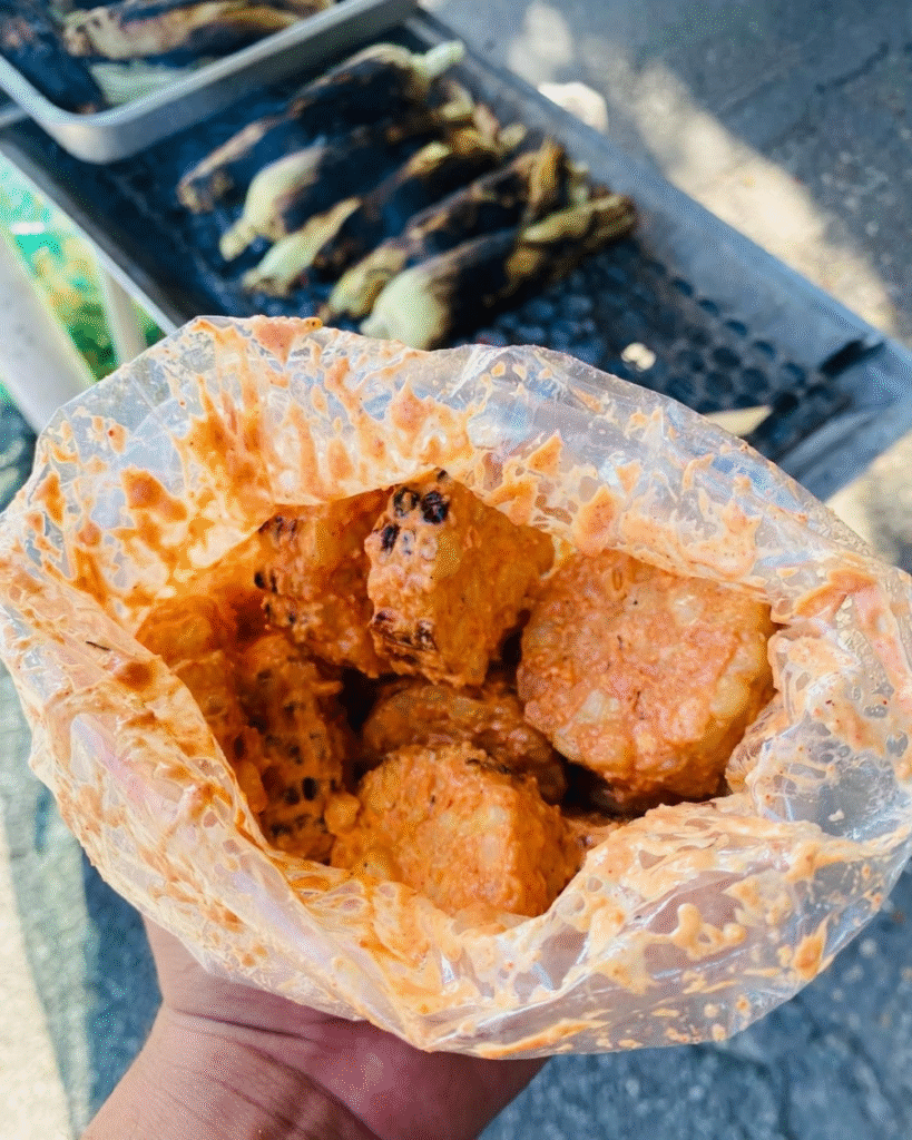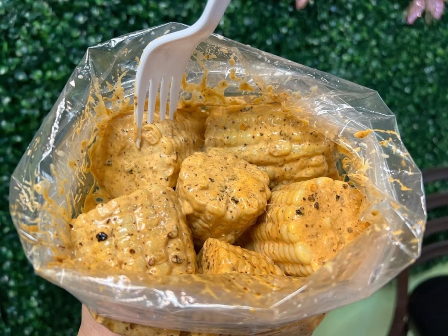 Las marranadas de elote son trozos de elote cocido y rebanado, servidos en bolsas de plástico y cubiertos con una cantidad casi absurda de complementos y aderezos.