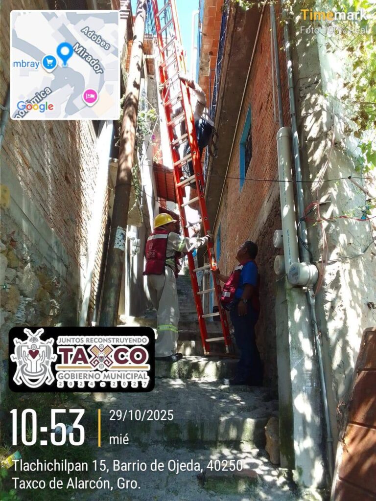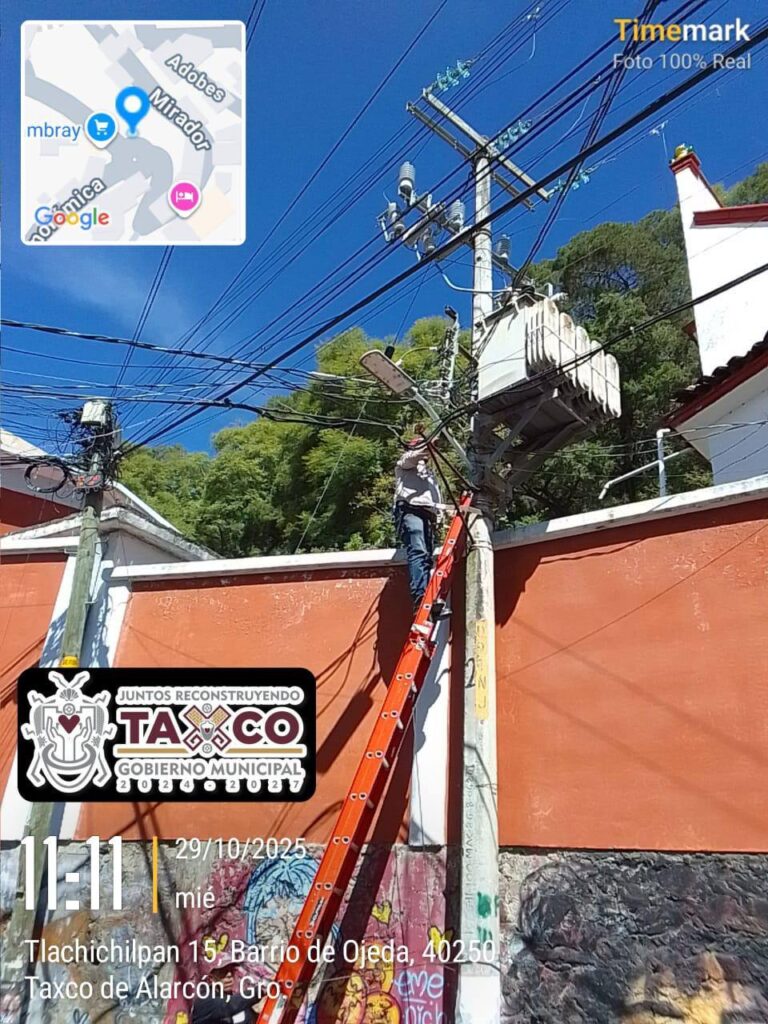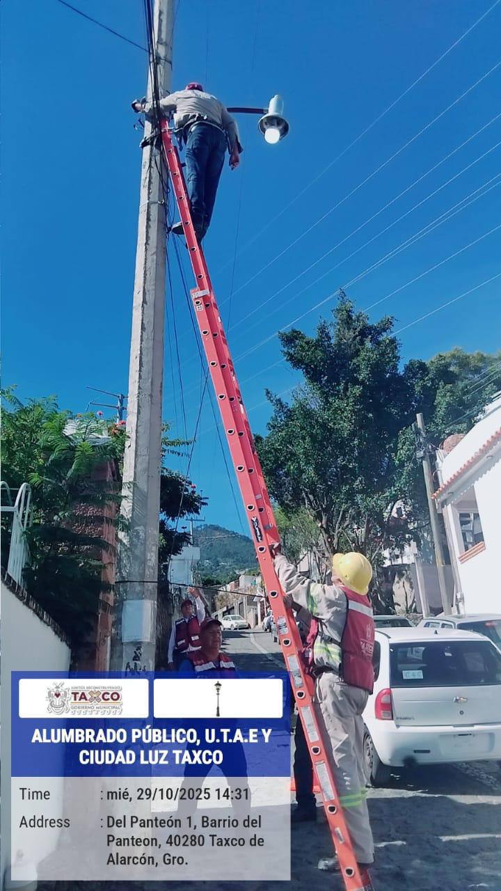 Taxco, Gro., a 03 de noviembre del 2025.- Por instrucciones del Presidente Municipal de Taxco, Arq. Juan Andrés Vega Carranza, y en coordinación con la Dirección de Alumbrado Público, se realizaron trabajos de mantenimiento y mejora del sistema de iluminación en diferentes puntos de la ciudad.