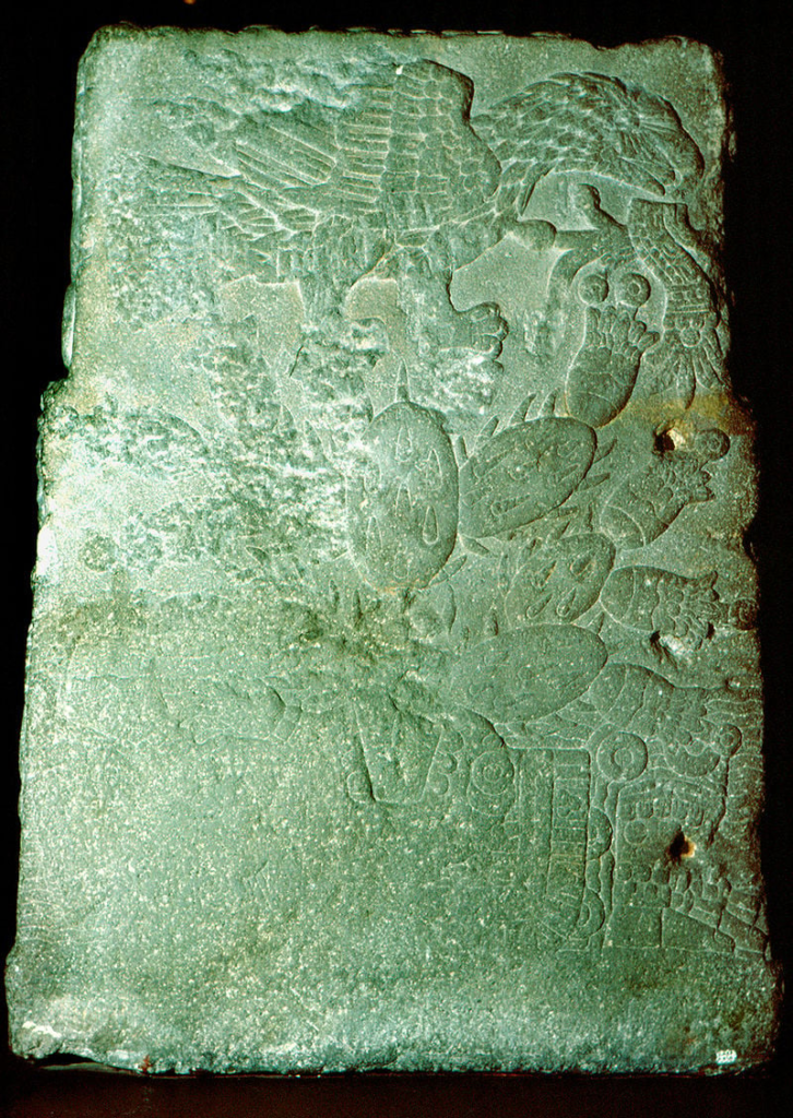 Tras su prolongada peregrinación, los mexicas al fin habían logrado encontrar el signo para establecer su hogar, de acuerdo a los designios de su dios tutelar Huitzilopochtli. Se trataba de un águila parada sobre un nopal, en un islote del lago de Texcoco. En algunas fuentes y códices, simplemente la rapaz aparece erguida; en otros, está devorando animalillos del lago o una serpiente. Probablemente de esta última, más bien se trate del símbolo del atlachinolli, del náhuatl: atl (agua) y tlachinolli («que se quema»), es decir, el «agua que arde», un concepto mexica para referirse a la guerra y la sangre, el cual se basó en la dualidad y enfrentamiento del agua contra el fuego, los elementos naturales opuestos.