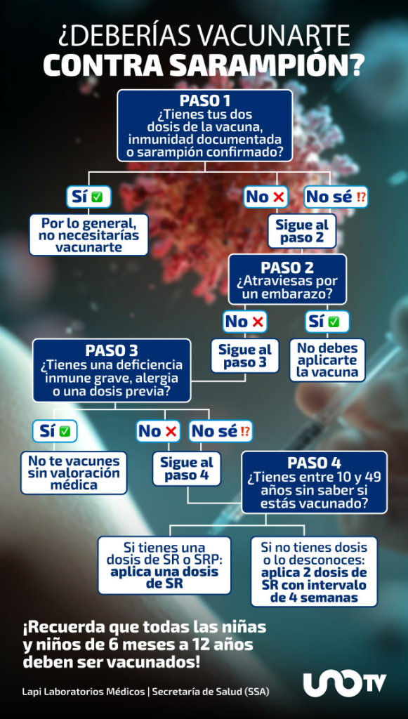 Lapi Laboratorio Médico asegura que si una persona de entre 10 y 49 años no cuenta con dos dosis documentadas de la vacuna contra sarampión, rubéola y paperas (SRP), debe aplicarse el llamado “esquema de rescate” aplicable en México con la vacuna contra sarampión y rubéola (SR):