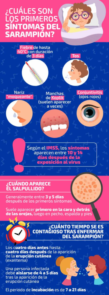 Sobre sus síntomas, el sarampión es conocido por causar un salpullido con manchas rojas. Sin embargo, los primeros síntomas pueden ser parecidos a los de influenza u otra enfermedad respiratoria, informó el Instituto Mexicano del Seguro Social (IMSS),