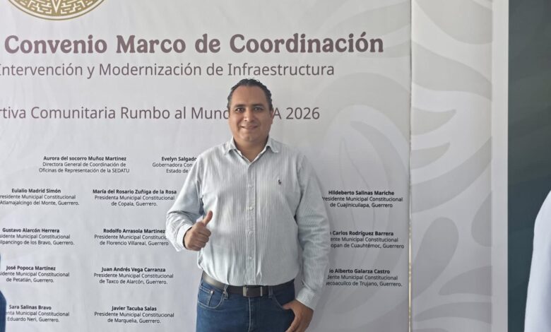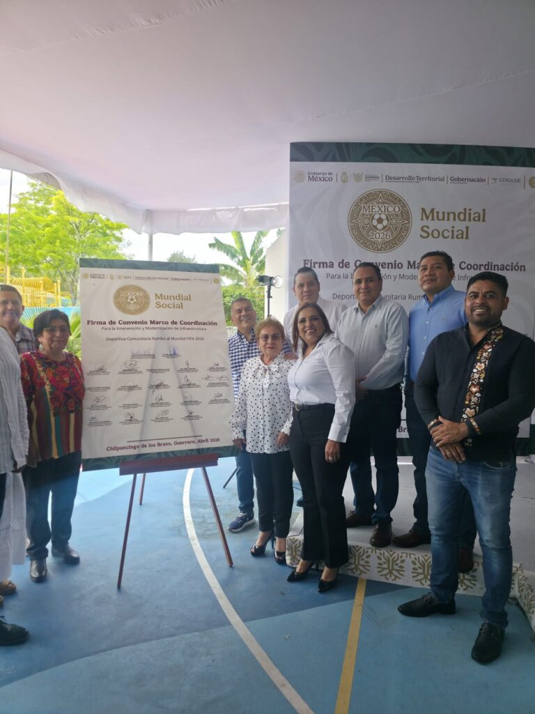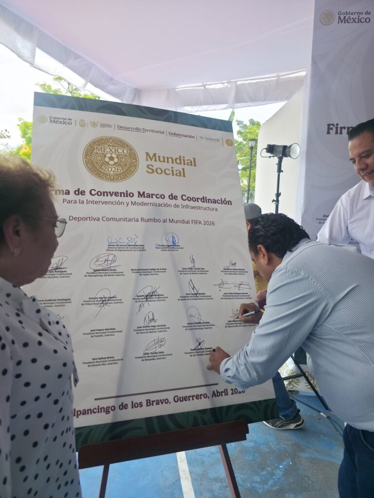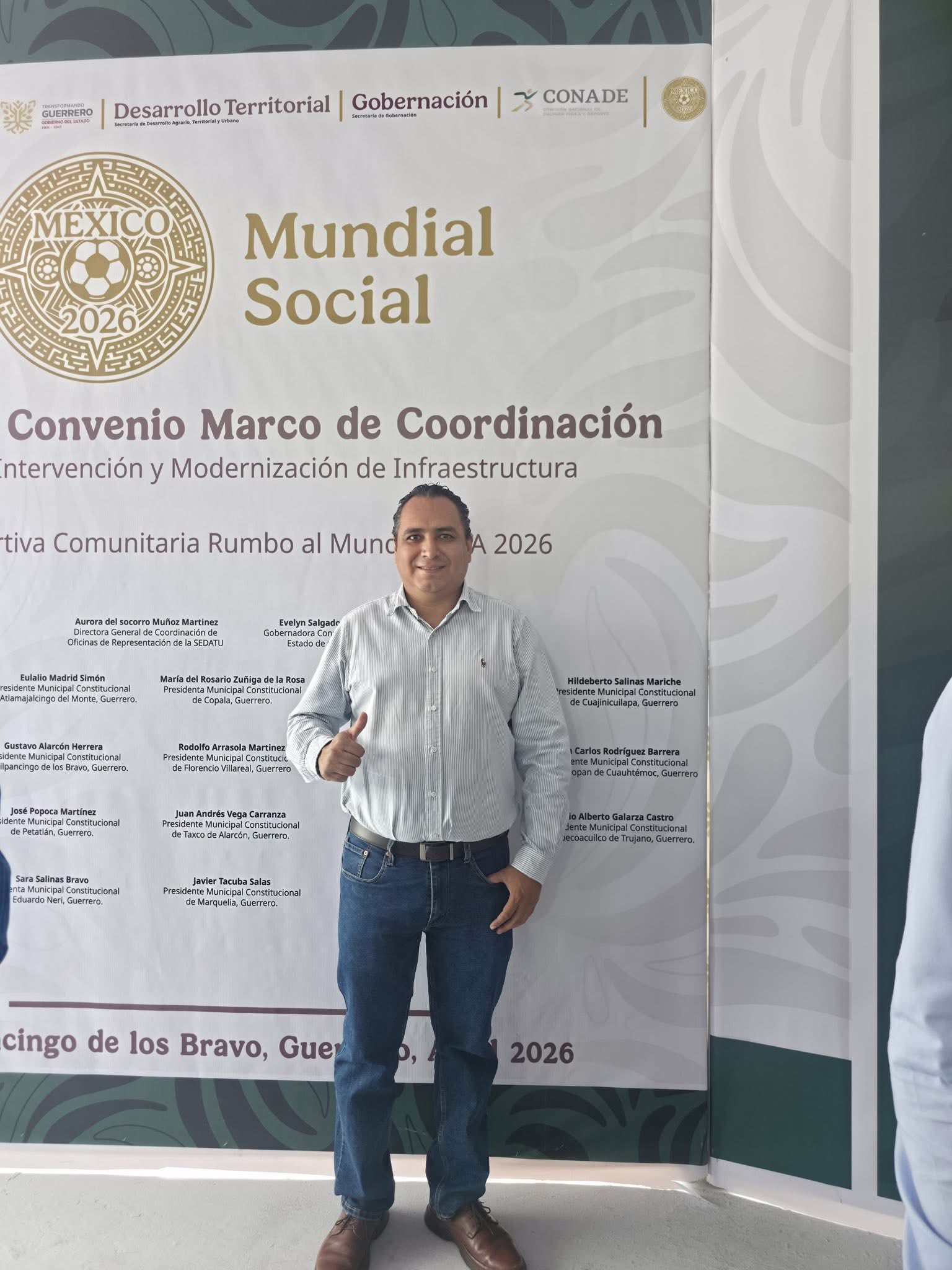 Tepecoacuilco, Gro., a 14 de abril del 2026.- El municipio de Tepecoacuilco se suma al impulso deportivo rumbo al Mundial FIFA 2026, con la participación del alcalde Julio Galarza en la firma del Convenio marco de coordinación para la intervención y modernización e infraestructura deportiva comunitaria, iniciativa que busca fortalecer espacios deportivos en beneficio de la población